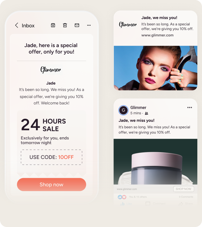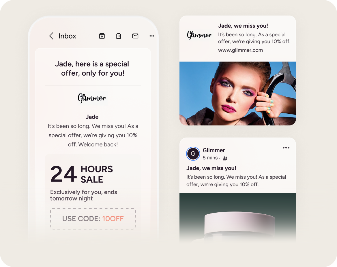 Use dados em tempo real para entregar mensagens consistentes e relevantes na Web, WhatsApp, e-mail, SMS e muito mais. Com o Architect, a solução de orquestração de jornadas da Insider One, você lança experiências impactantes em uma única plataforma e encontra seus shoppers de beleza onde quer que eles estejam.