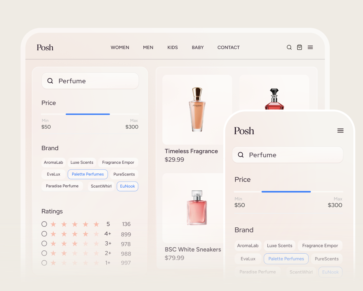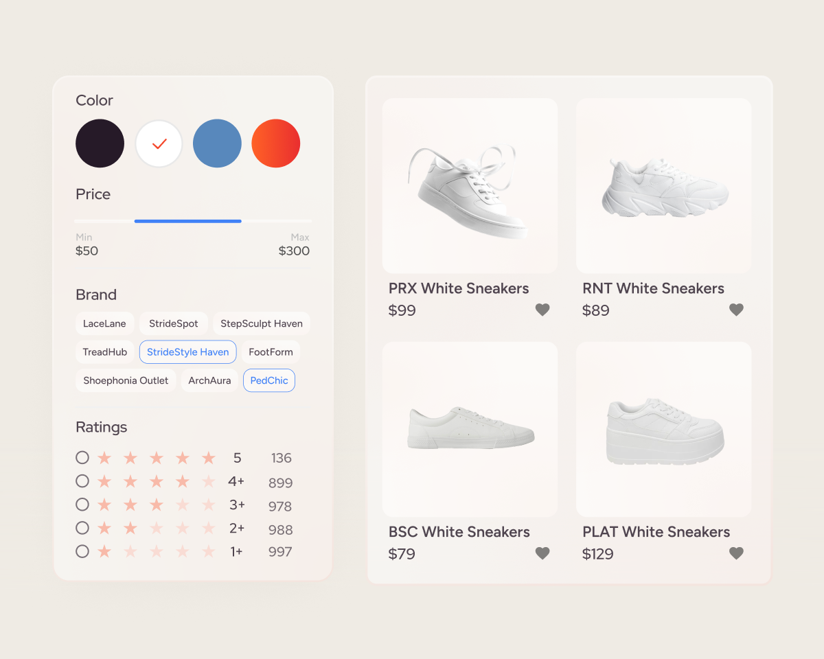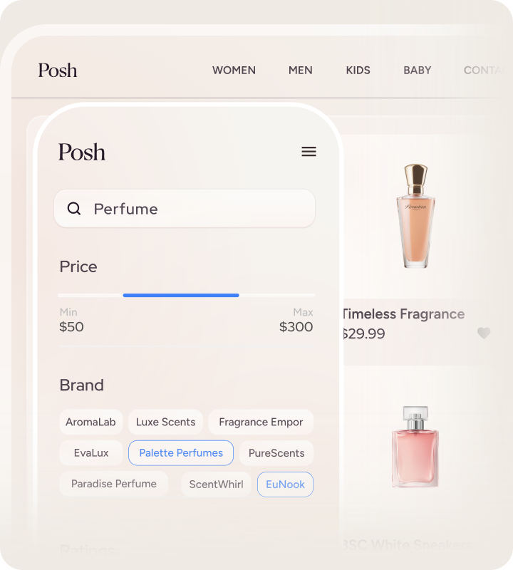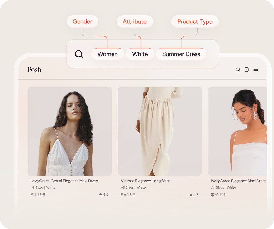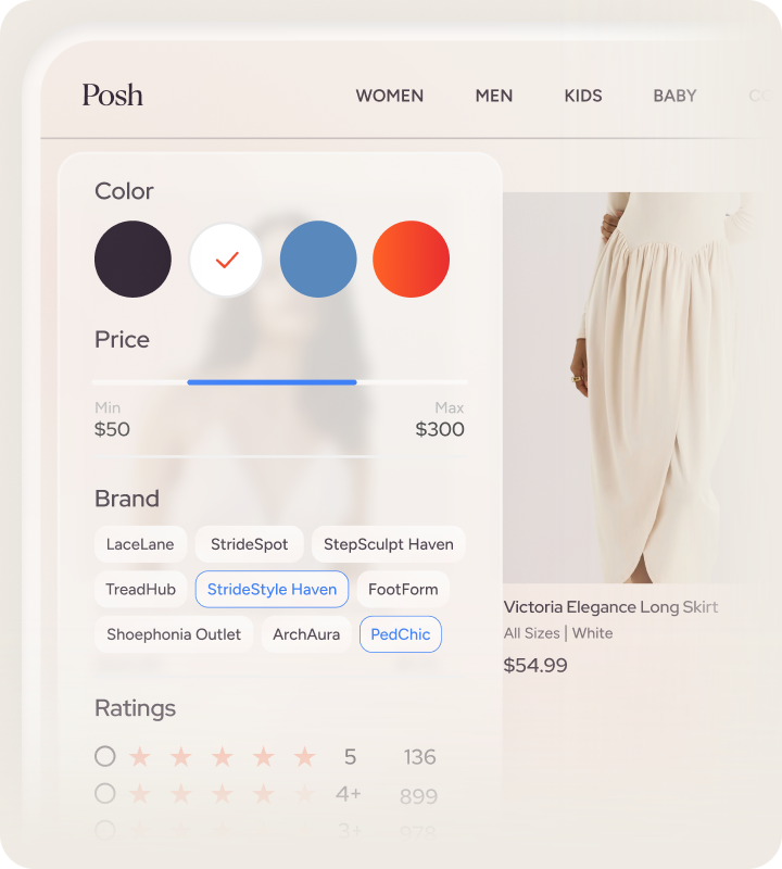 Help shoppers refine results effortlessly with advance and pre-selected filters. Reduce friction and speed up discovery for faster paths to purchase.