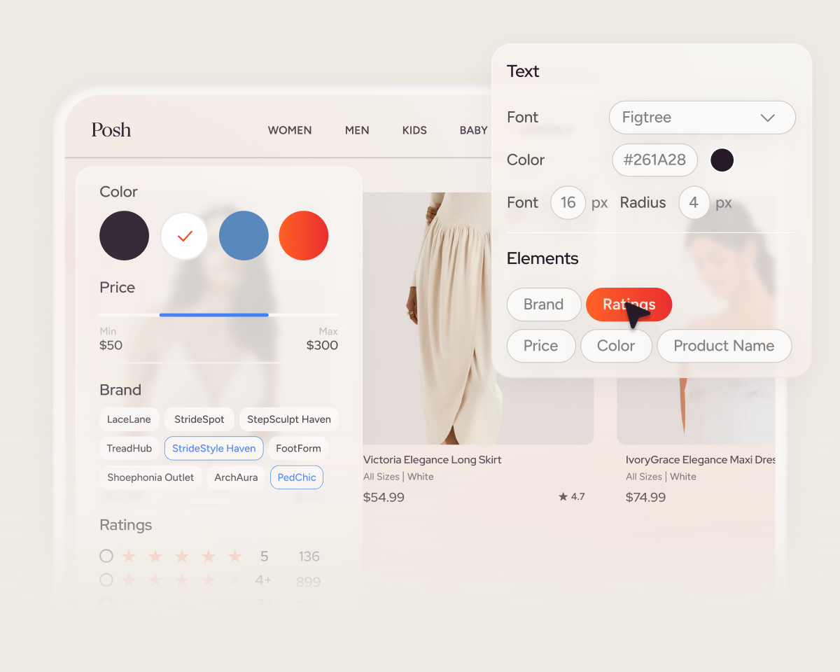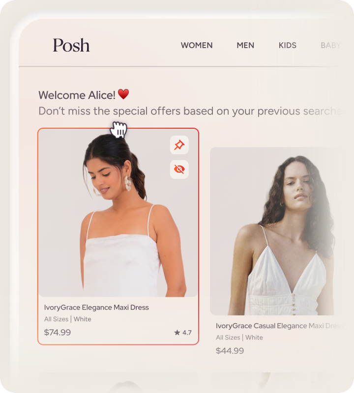 Rearrange products, adjust layouts, and personalize results in minutes, no dev support needed..