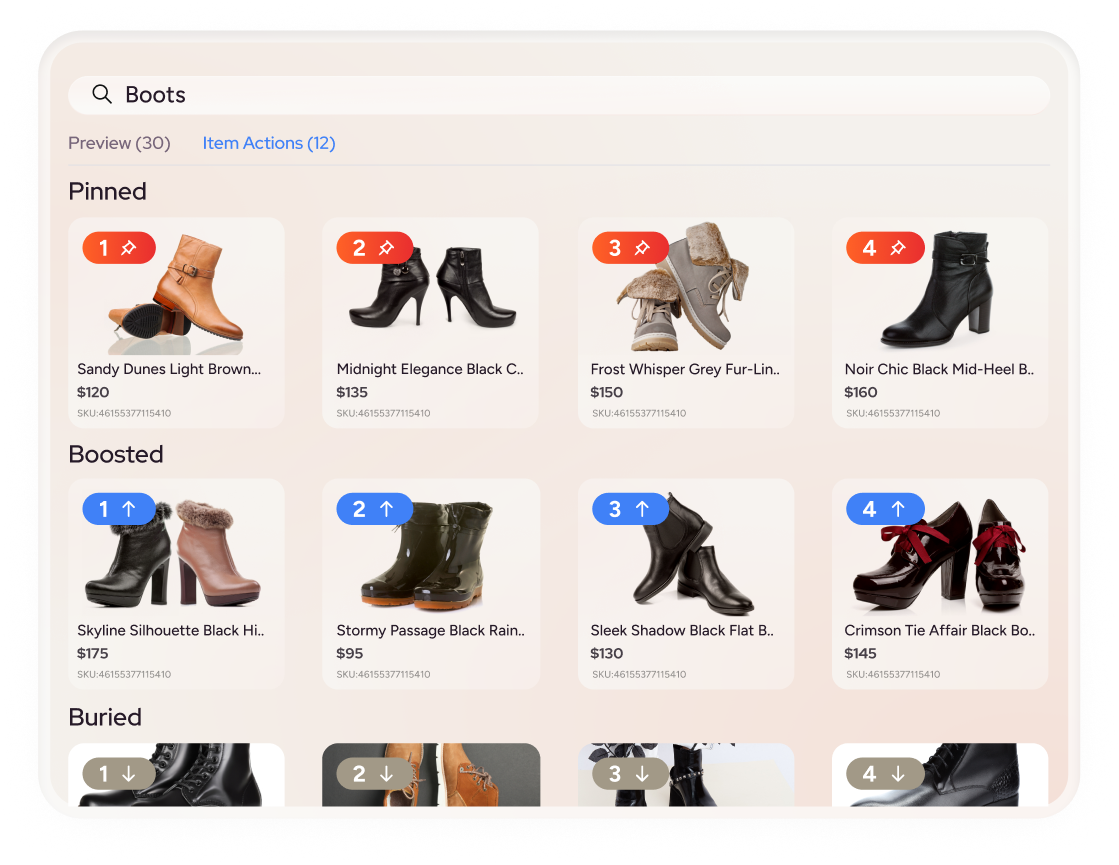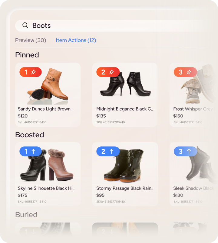 Manually boost, bury, hide, or pin products by attributes like price, brand, or size. Tailor search outcomes to align with business goals and spotlight high-margin products.