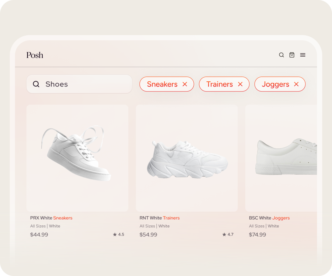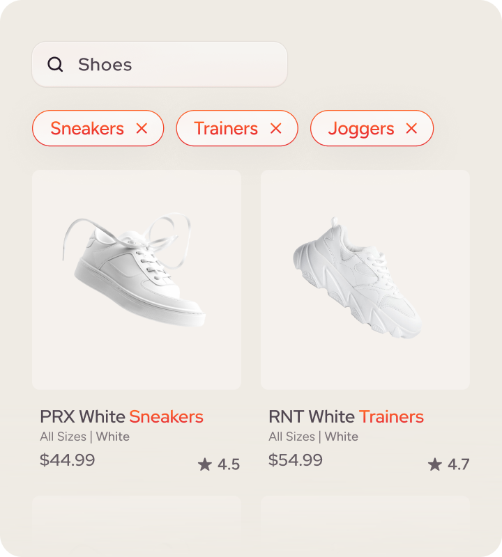Expand keyword meanings and show exact results based on intent, whether your user searches for “trainers,” “running shoes”, or “lightweight red trainers”.