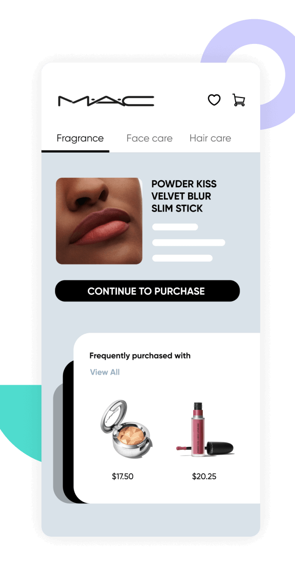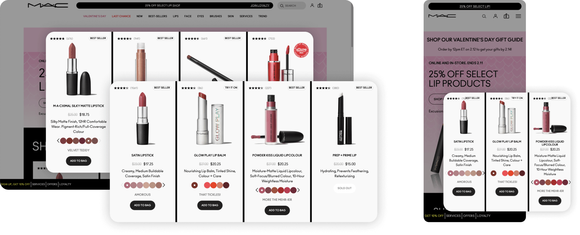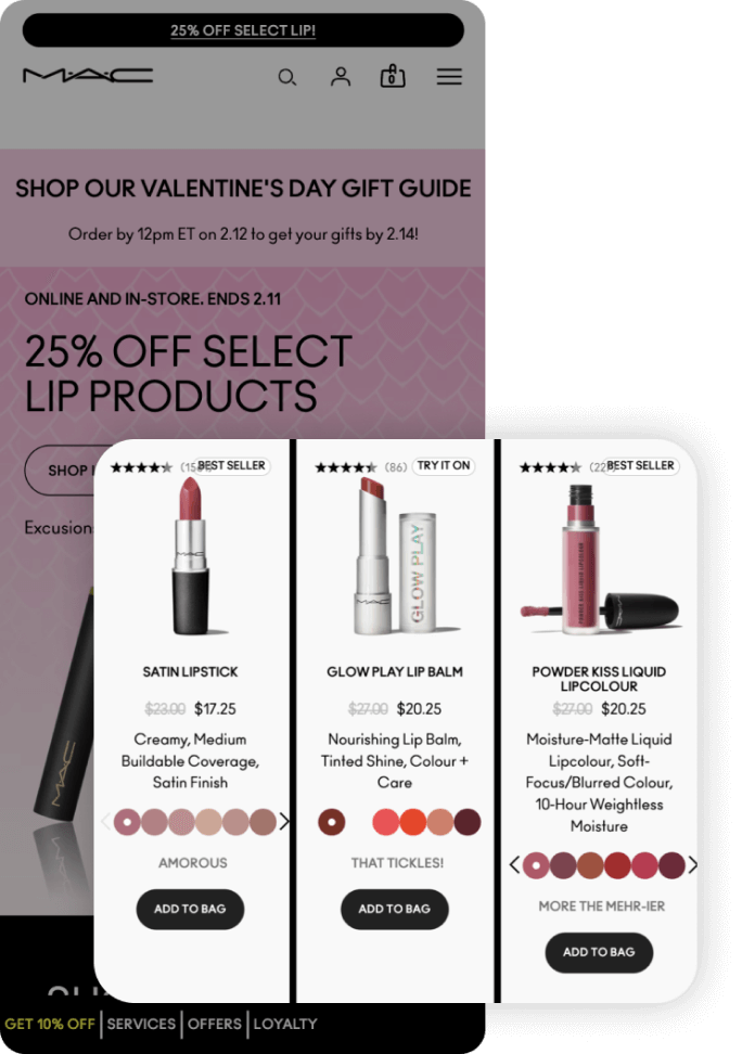 MAC’s ecommerce team was looking to increase sales and knew the best way to do this was by tempting customers with additional products to purchase to increase AOV. However, promoting random products to shoppers was damaging the customer experience due to a lack of relevance.