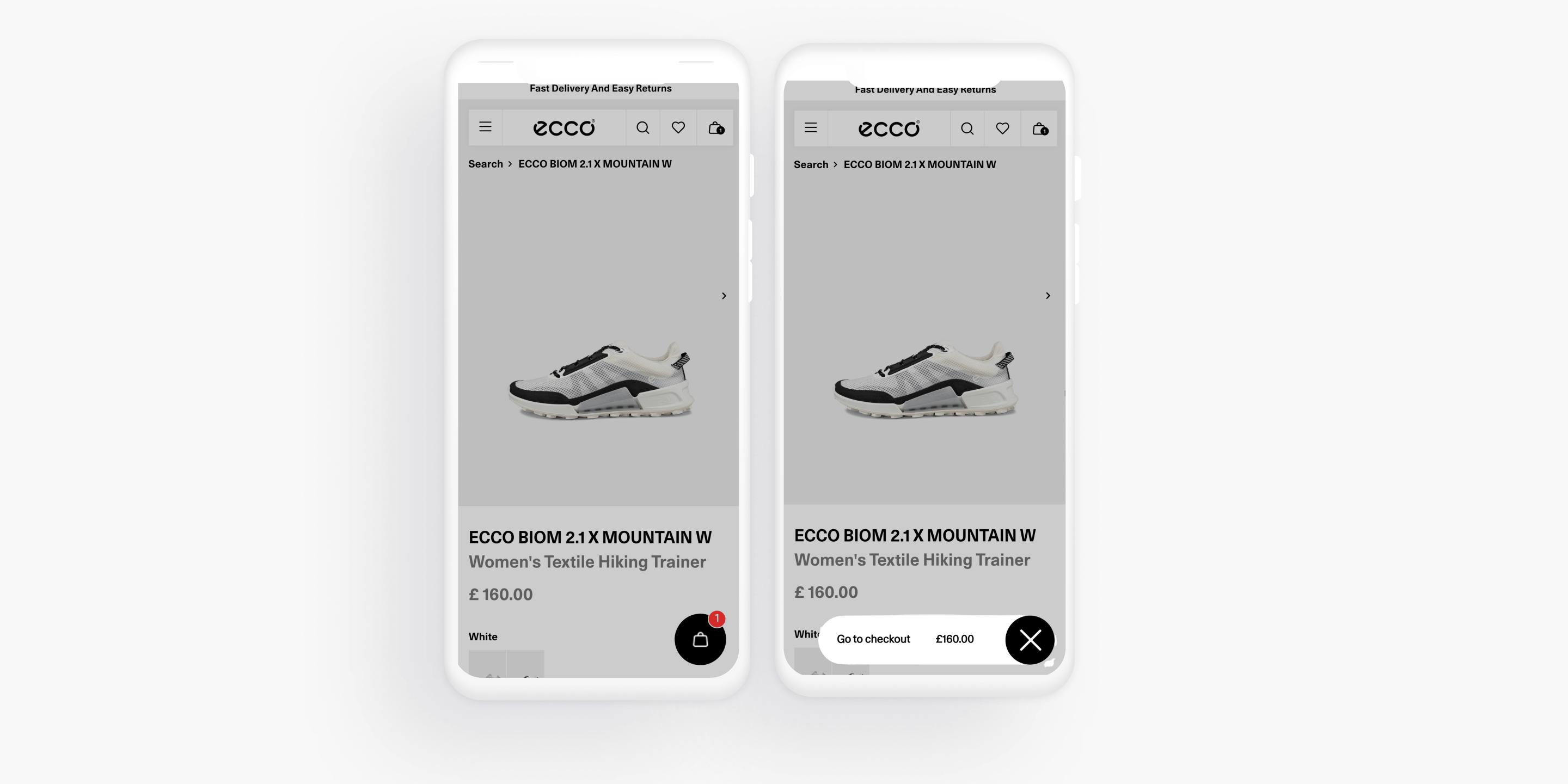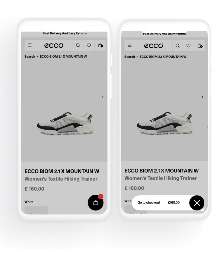 Using Insider’s Floating Cart Template on mobile devices, ECCO displayed an engaging message that displayed the total number of items in the basket which updated dynamically as a user added an item to the basket.