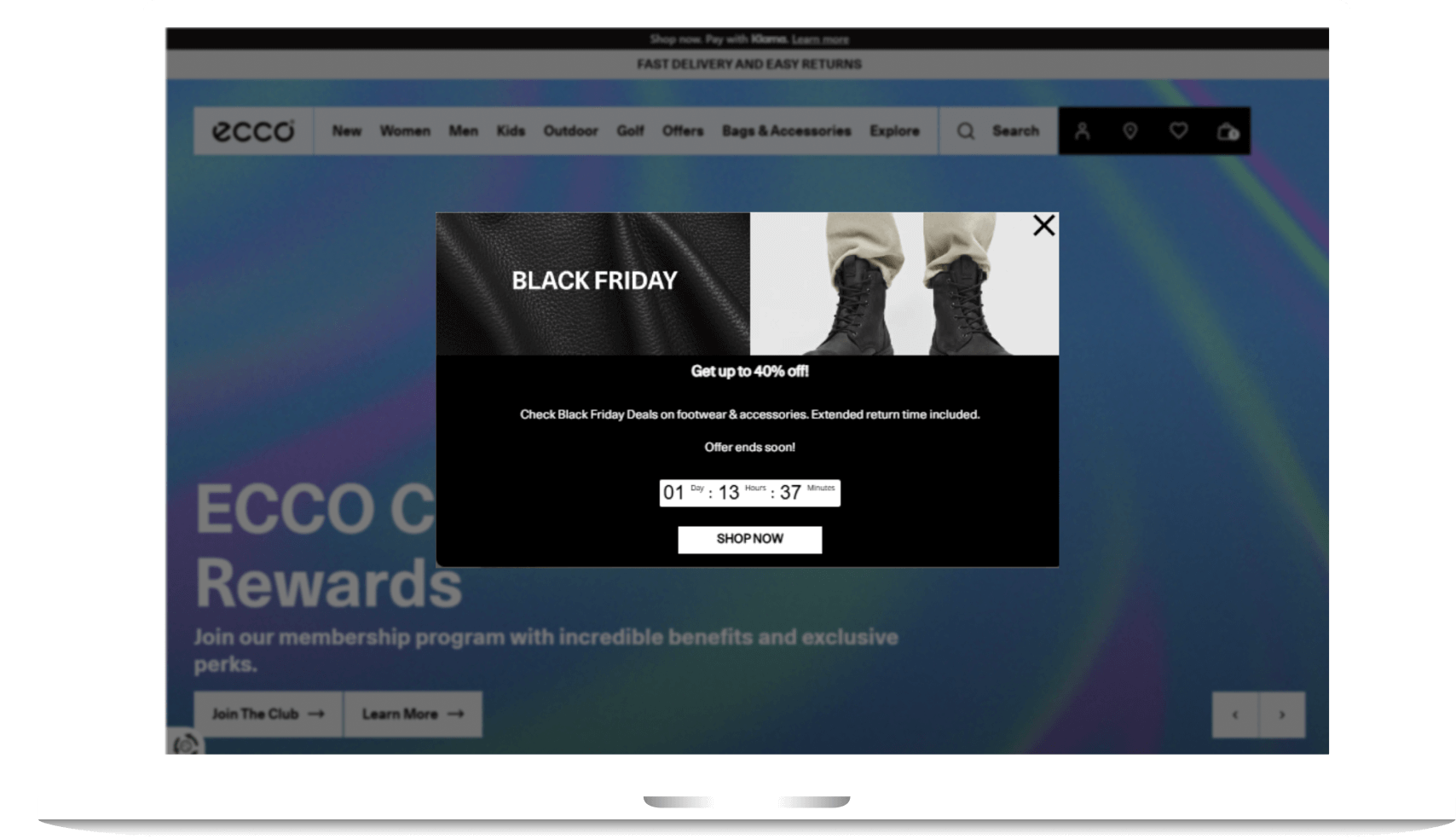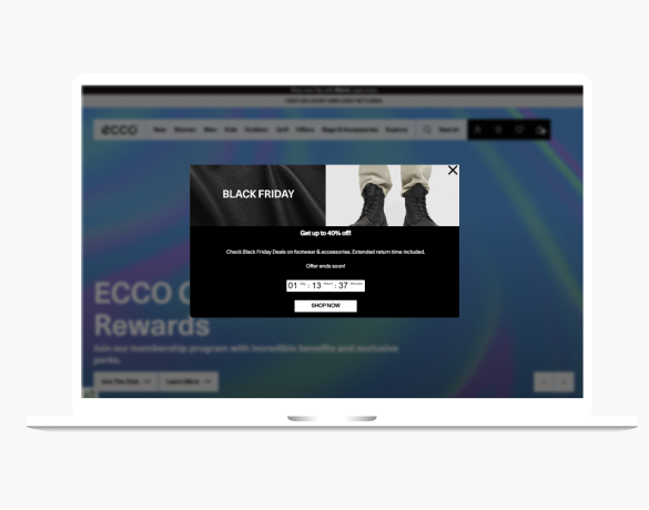 Using Insider’s library of 100+ ready-made personalization templates, ECCO deployed a personalized exit-intent overlay to users who exhibited exit intent after spending 10 seconds on the site.