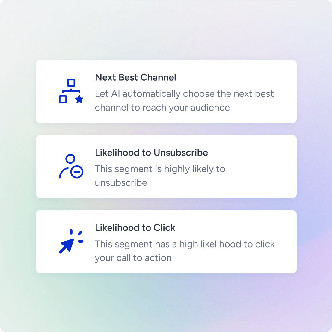 Use AI-powered models such as Next Best Channel and Likelihood to Click/Unsubscribe to connect with customers when and where they’re most likely to engage. Deliver seamless customer engagement across 12+ channels from a single platform.