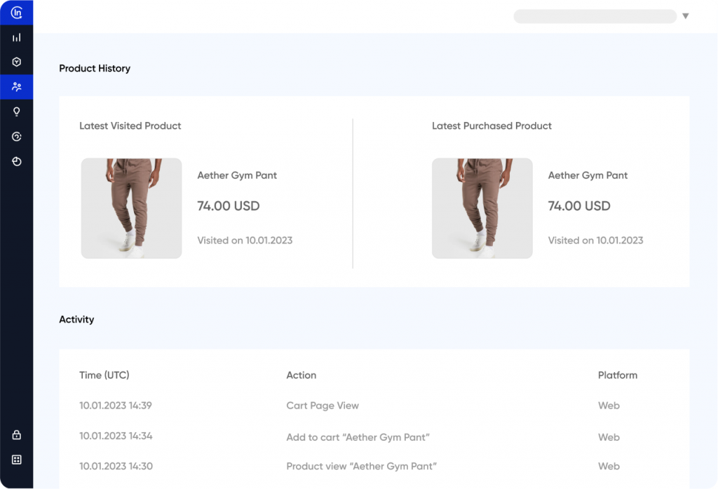 Either way, our platform takes that data into account when determining the next step. As a result, Insider One can suggest products that complement black shoes and gray hoodies (if they bought from another site) or show lower-priced items to get this customer to convert.